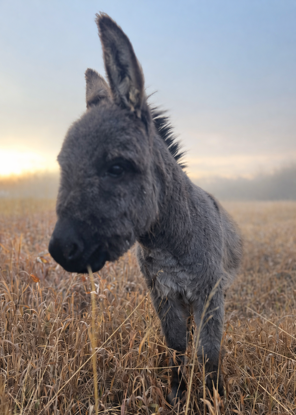 Little Levi, our male mini donkey known as a Jack, born April 23, 2025. Levi is as sweet as they come. He loves hugs and to be rubbed along his neck. He has not yet found his voice. He sounds more like a squeaky toy than a donkey.